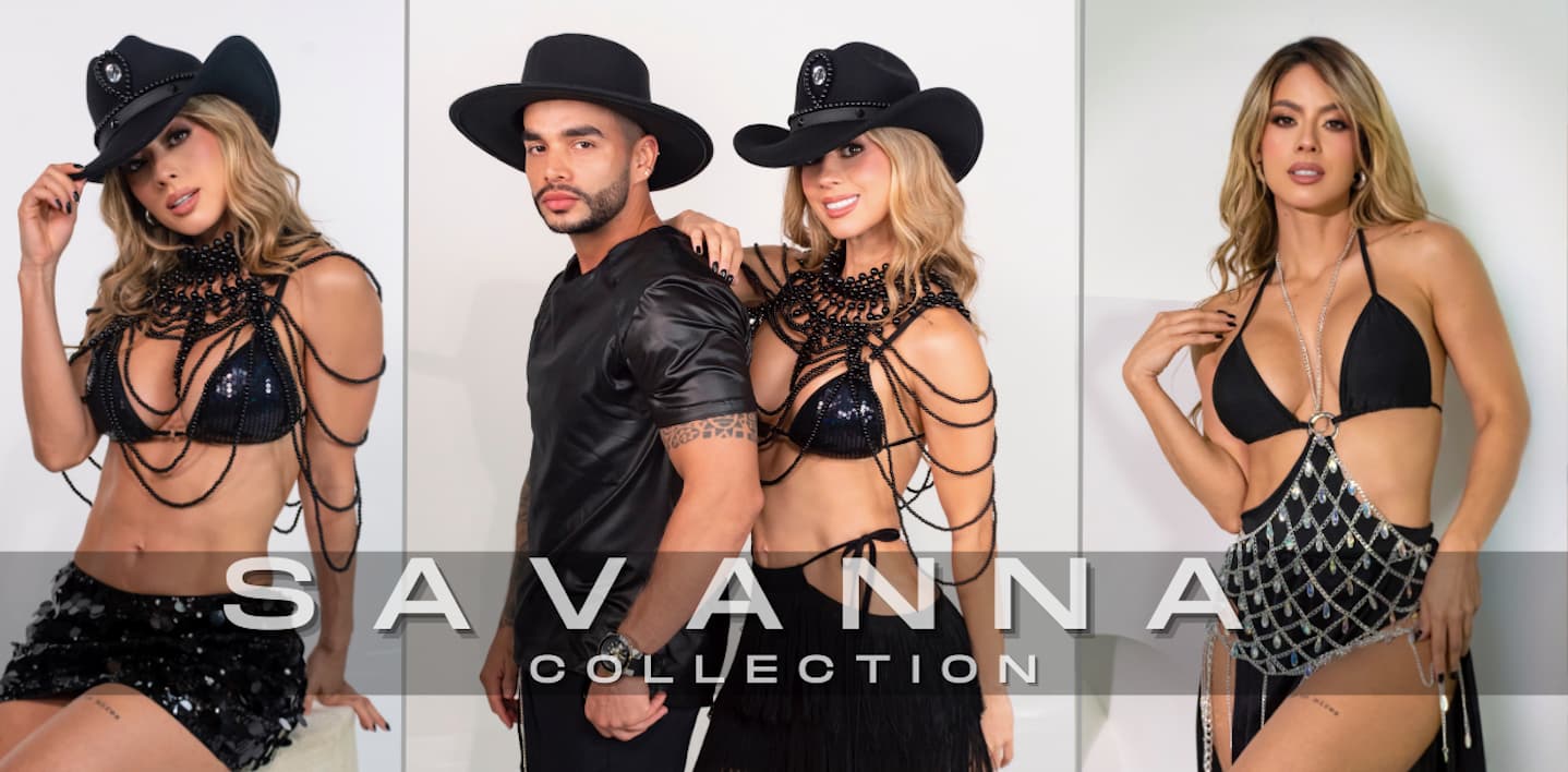Ofrecemos festival outfits, sets coordinados, safaris, vestidos de baño, salidas de baño, accesorios (kepis, sombreros, gafas, collares), botas texanas y opciones para hombre. Nuestra propuesta mezcla estética rave, western y moda colombiana de alto impacto. 🔥
