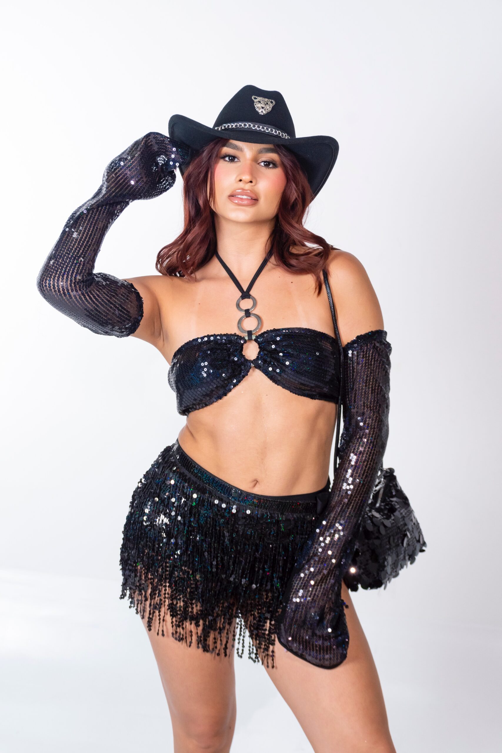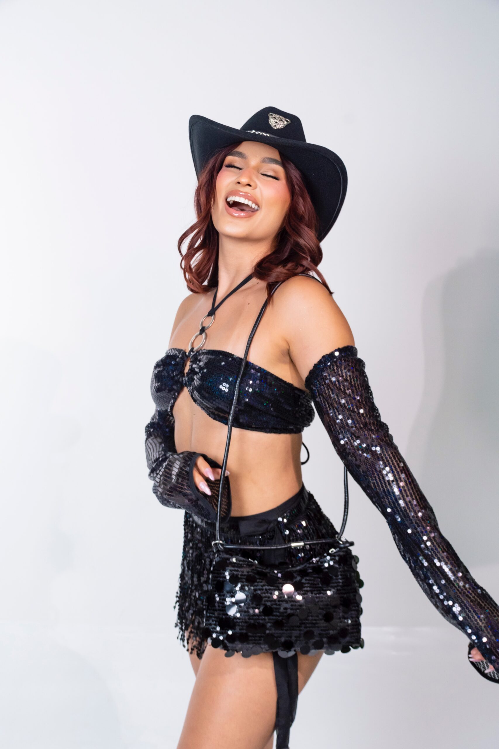 falda en lentejuelas,tanga tiro alto,crop top en lentejuelas,mangas individuales